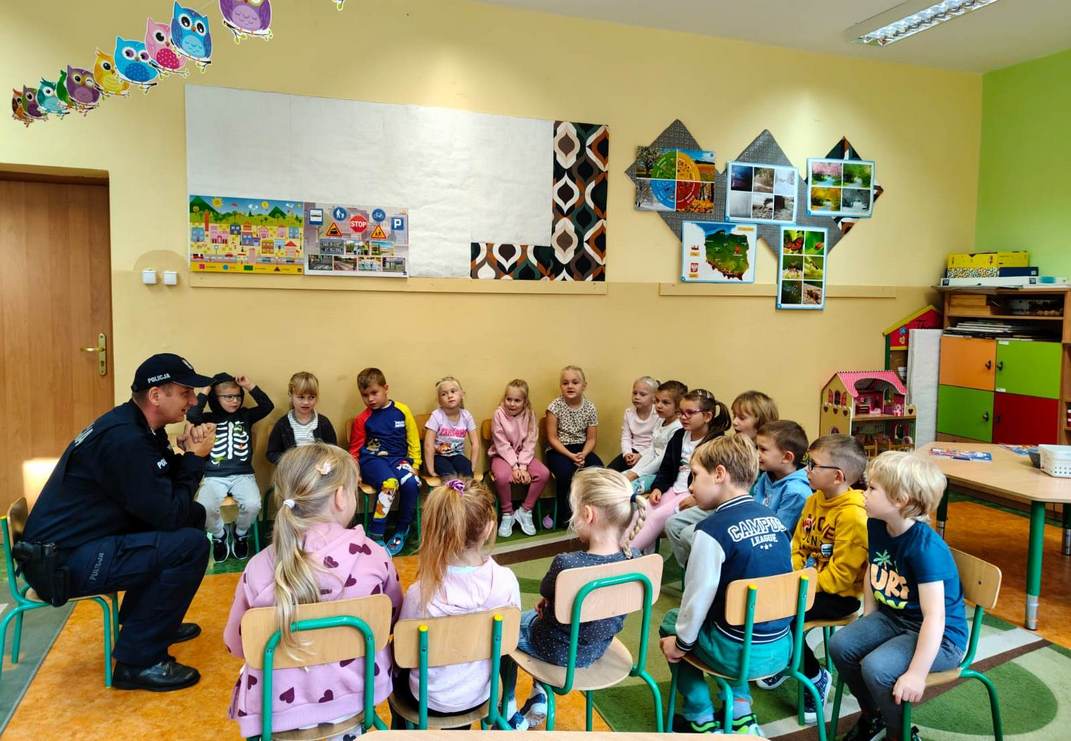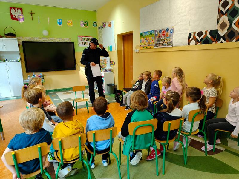 18 września w naszej „zeróweczce” gościł tato Martynki, który jest policjantem Komisariatu Policji w Ozimku. Pan Paweł Wcisło przybliżył dzieciom podstawowe zasady bezpiecznego poruszania się po drogach oraz jak reagować w sytuacjach różnych zagrożeń. Przypomniał korzyści z noszenia ubrań posiadających elementy odblaskowe oraz ważne numery alarmowe.
