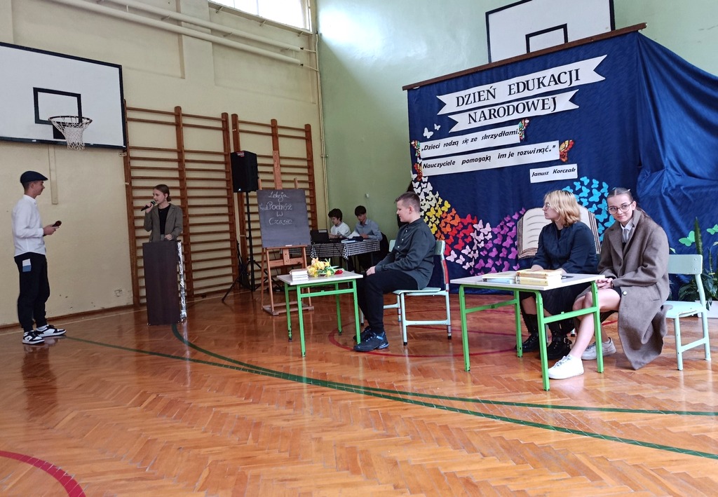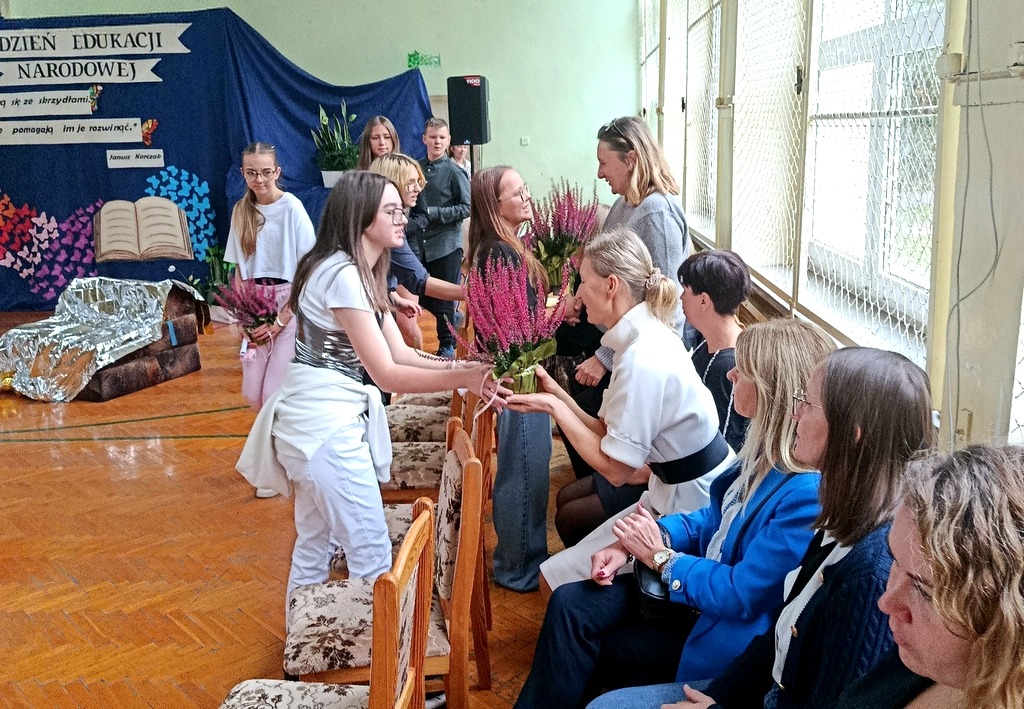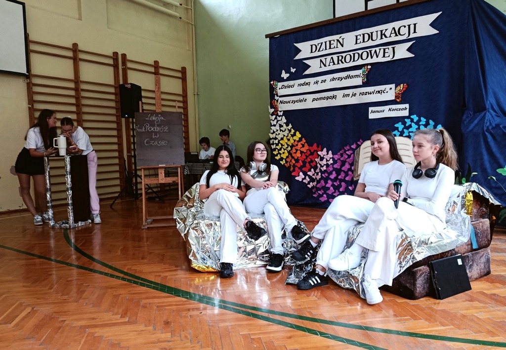 Następnie uczniowie zaprezentowali część artystyczną, która w tym roku miała wyjątkowo humorystyczny charakter. Przedstawienie zabrało widzów w podróż przez trzy epoki szkolne – do szkoły z 1925 roku, współczesnej oraz tej przyszłościowej z roku 2125. Każda z odsłon była pełna zabawnych scenek i żartobliwych dialogów, które skłaniały do refleksji nad tym, jak zmienia się edukacja jeżeli chodzi o metody formy i narzędzia pracy, ale niezmienne pozostają wartości takie jak wiedza, szacunek i współpraca.