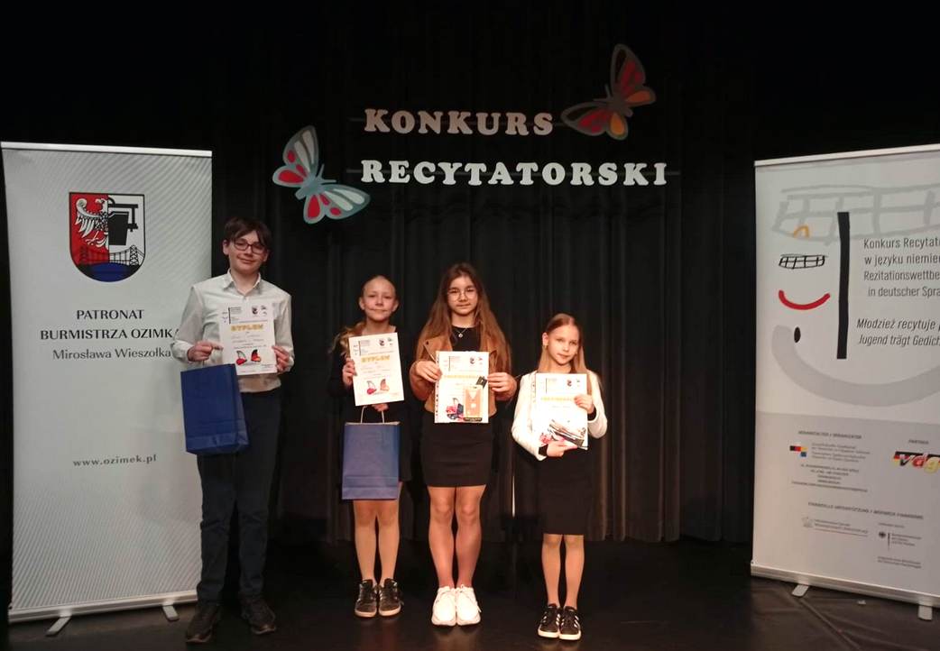12 marca w Domu Kultury w Ozimku odbył się gminny konkurs recytatorski w języku niemieckim "Jugend tragt Gedichte vor". Naszą szkołę reprezentowały: Milena Leś oraz Marta Fikus z klasy V, Zuzanna Hornik z klasy VI i Karol Borowski z klasy VII.